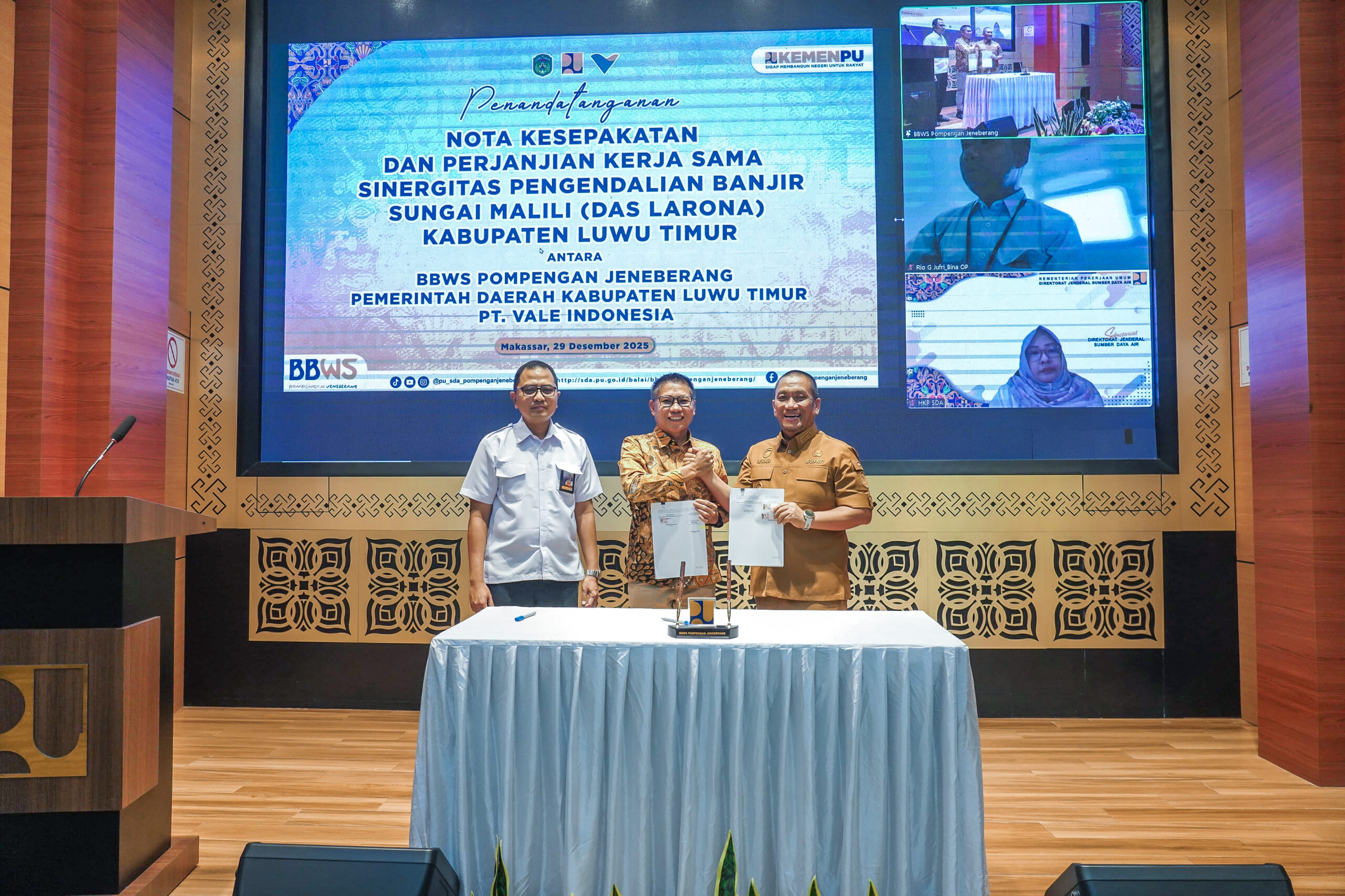 Kesepakatan ini ditandatangani oleh Bupati Luwu Timur Irwan Bachri Syam, Kepala BBWS Pompengan Jeneberang Heriantono Waluyadi, serta Wakil Presiden Direktur sekaligus Chief Operation and Infrastructure Officer PT Vale Indonesia, Abu Ashar.